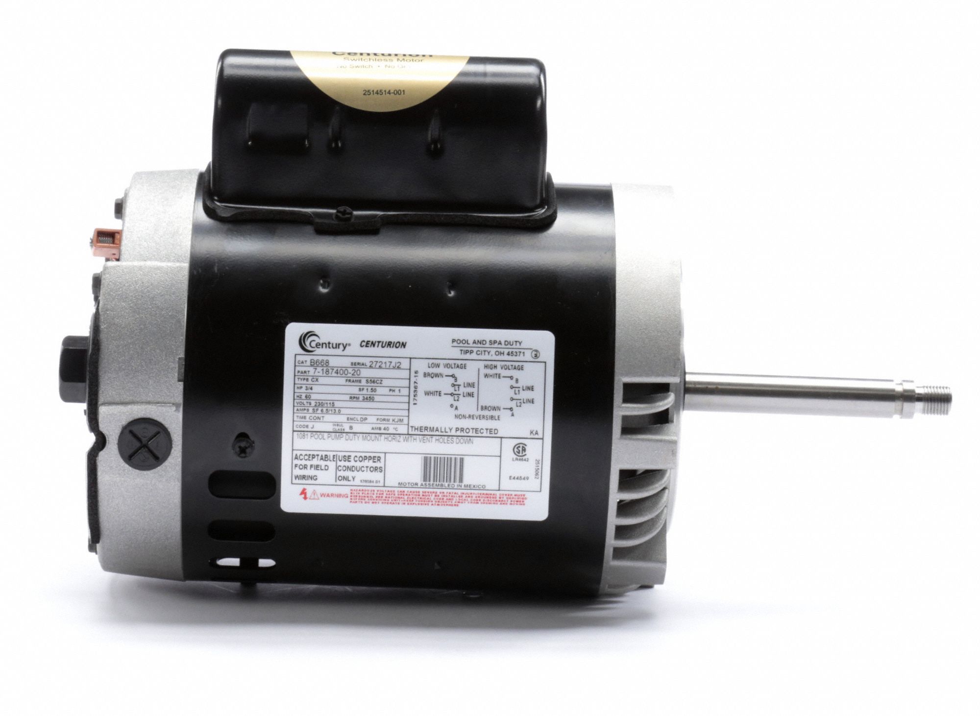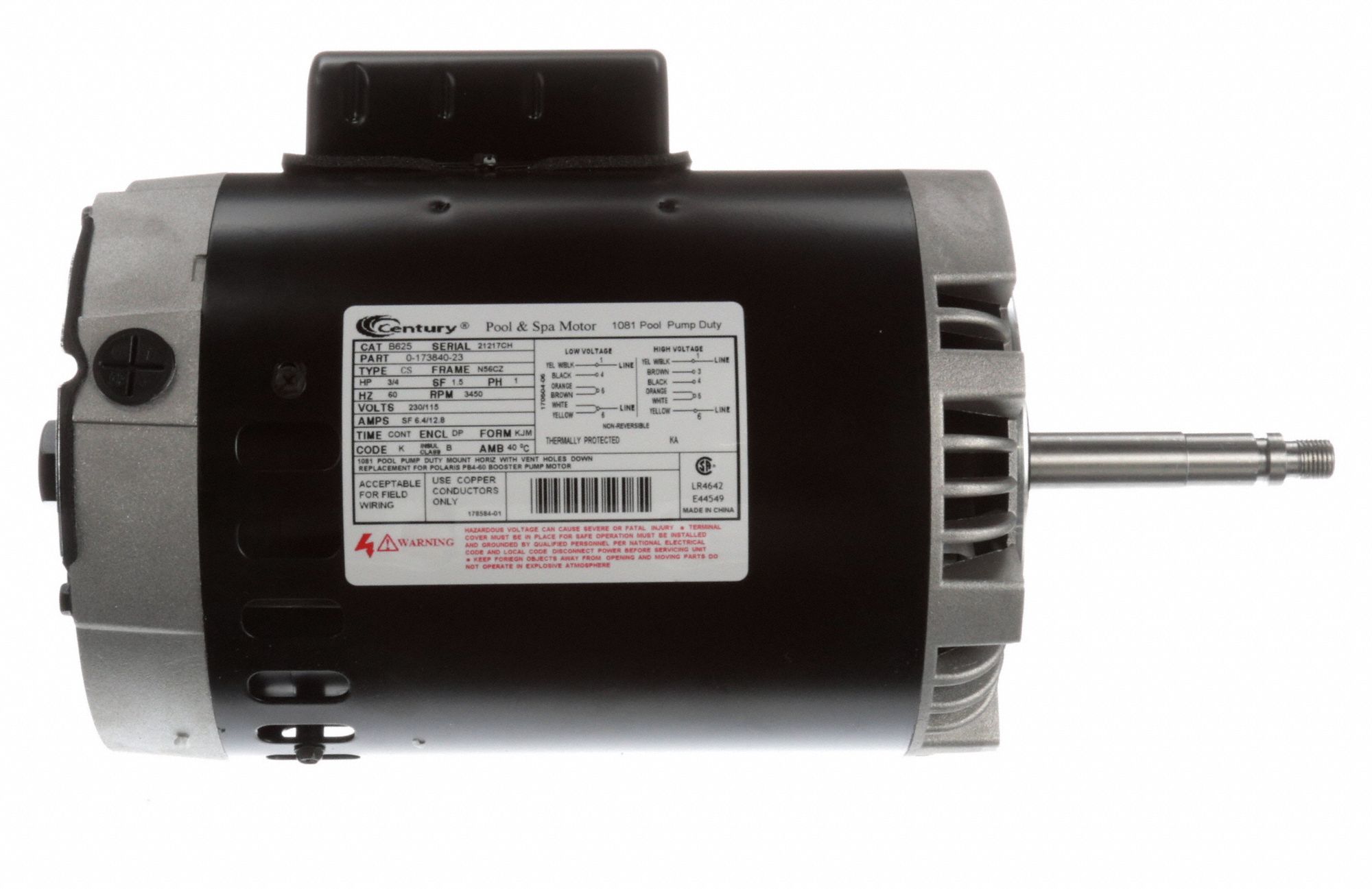 above ground pool applications. Some are used on pumps on the lower end of the in ground pool market. This design has a start winding and a start switch, but no capacitors. 2. Capacitor Start.This is a very common single-phase motor found on in ground pool pump applications. The starting torque is higher (150-175% of full load) and starting current Regal Beloit B2854v1 Century 1.50 HP 3450 RPM Stainless Steel Pool Pump Motor. $229.99 New. CENTURY B625 3/4 HP 3450 RPM Pump Motor. 4.7 out of 5 stars. (7) Total Ratings 7, $216.26 New. Centurion(r) switch-free designs have lower starting and running amps. Under rare low line voltage conditions the Centurion(r) designs have operated down to 75% of rated voltage. The only 6.5" inch "56-Frame" shell diameter means thicker shell material and greater heat dissipation capacity.